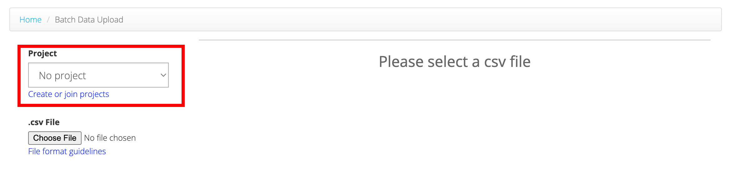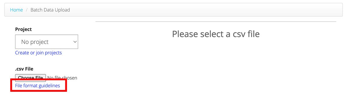 If all of the data you are submitting is part of the same Project, you can select your Project from the dropdown list. Please note, you will only see Projects listed in the dropdown menu if you have joined those Projects.