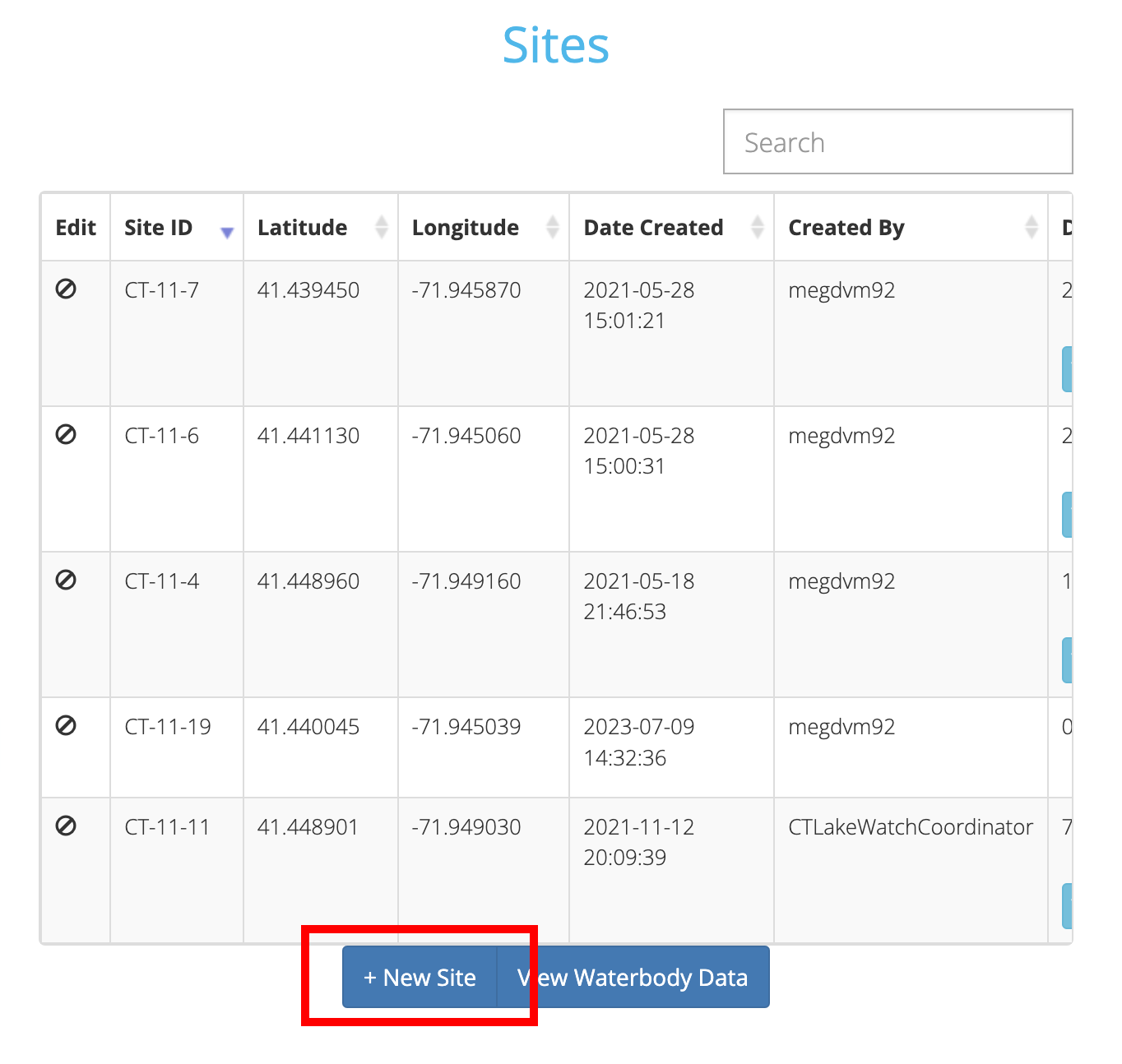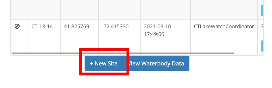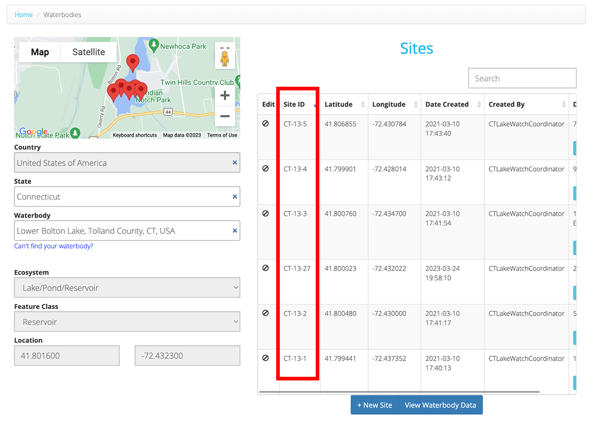 Once your waterbody has been selected, you should see a list of all current Sites for that Waterbody along with their geo-coordinates. You should also see the Sites as pins on the map. To create a new Site for the Waterbody, simply click the 'New Site' button.