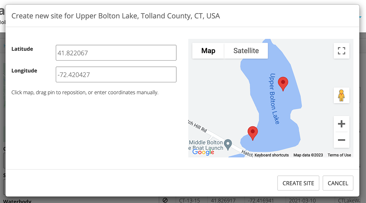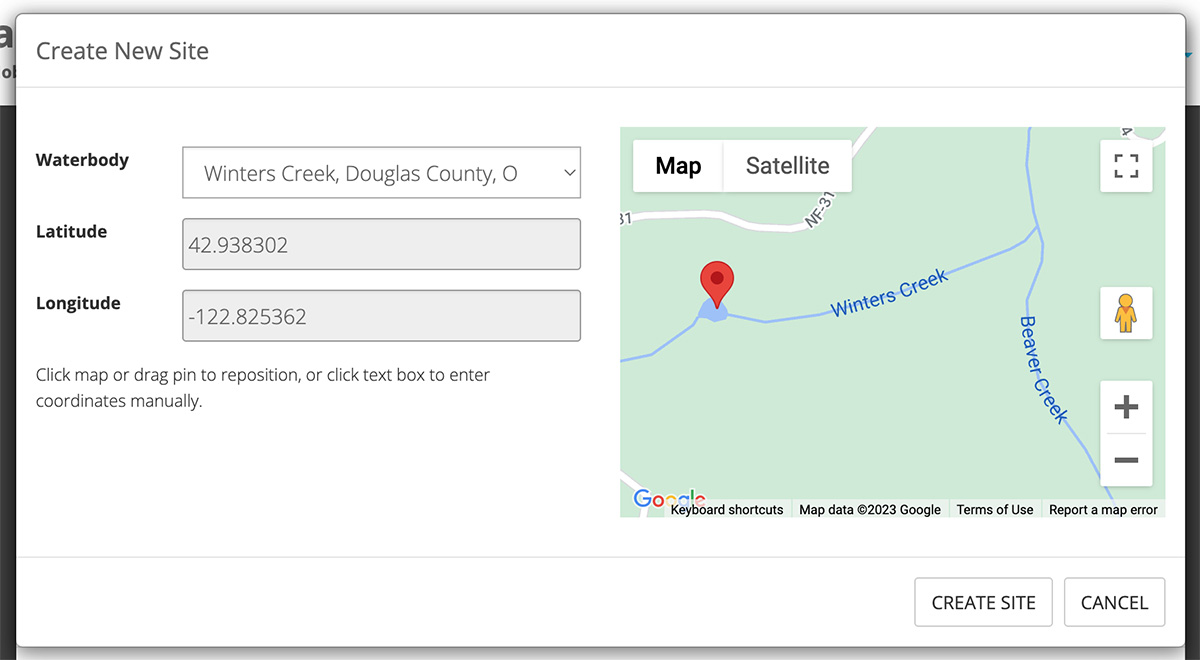 If your Site does not yet exist, you can create a new Site for the Waterbody. You will only need to know the latitude and longitude values of the Site location. You can enter the latitude and longitude manually or by clicking on the map.