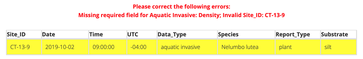 Once your csv file has been prepared for upload, you can select your file. After the file has been selected you may see some notifications if there are any errors in your file format. The rows that contain errors will be highlighted in yellow. Review these errors and make any necessary changes to your csv file. Re-select your updated csv file. If you are seeing errors that you are unable to correct, please contact us for support.