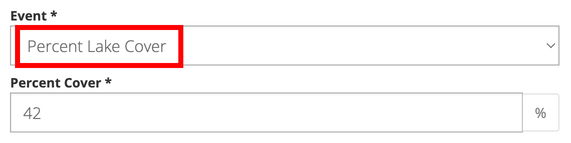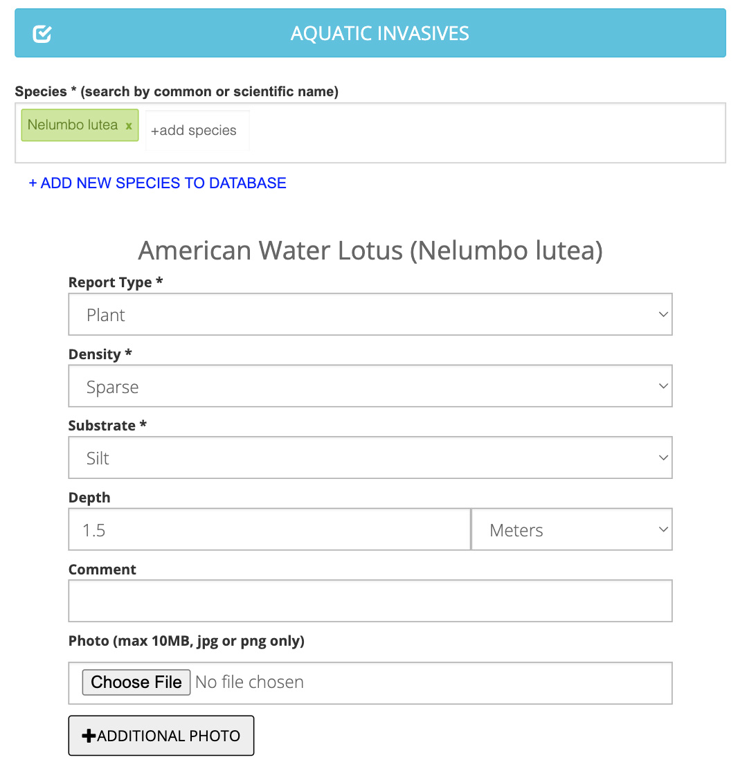 Lake Observer offers a section for tracking aquatic invasive species, both plant and animal. From the web submission form, expand the Aquatic Invasive section. In order to add an observation for a known species, that species needs to be added to our database. You can see a full list of species in our database on our species list page. For instructions on adding a new species to our database, see below.