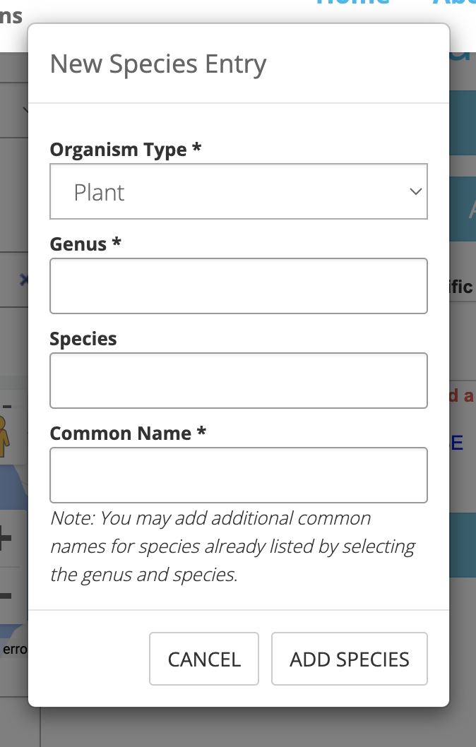 If you need to add a new species to our database, you can do so either from the submission page or from the species list page. Simply click the blue 'Add New Species' button below the Species text field. You will need to enter the following information when adding a new species: