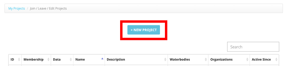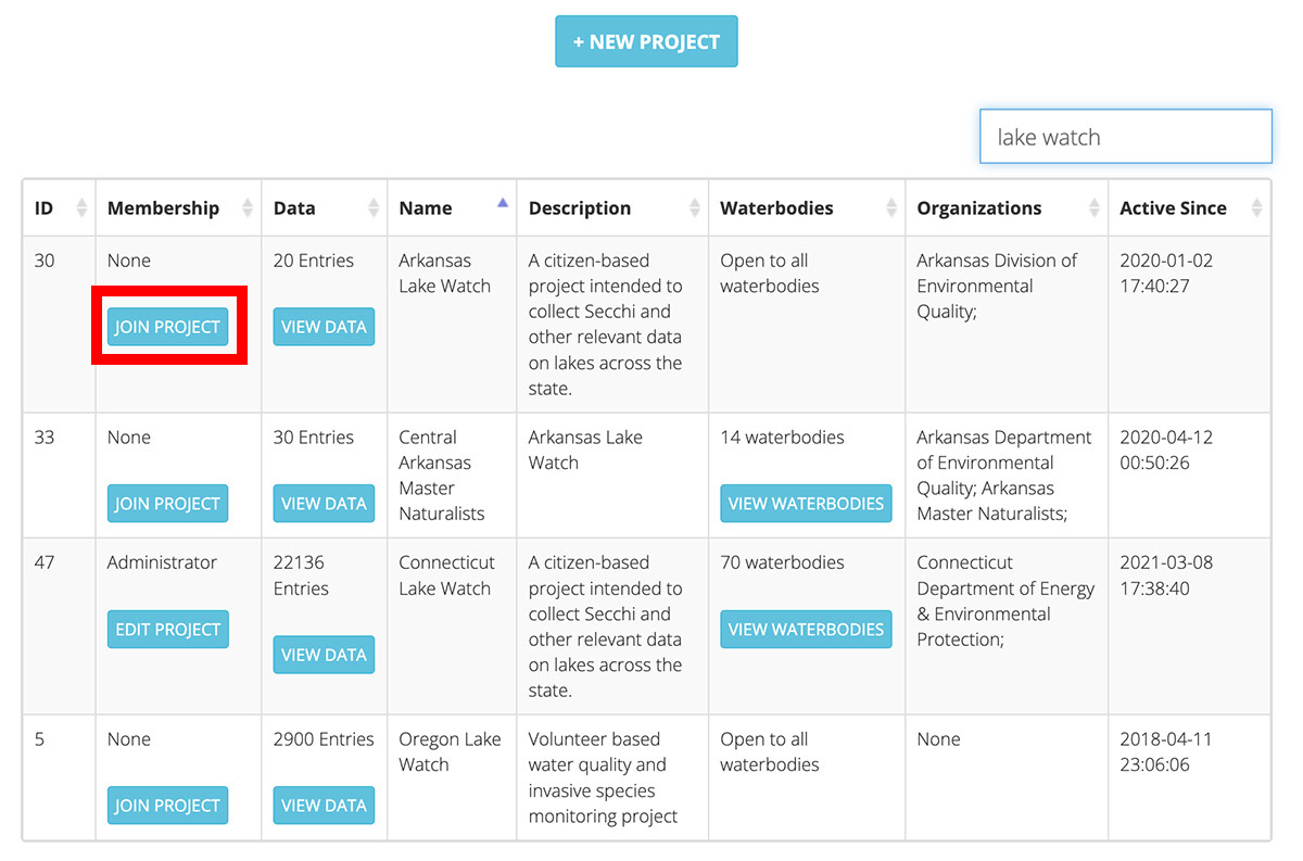 You can view a list of current Projects by selecting 'Projects' from the 'Data' menu, or by visiting lakeobserver.org/projects/view. You can also create a new Project from here by clicking the '+ New Project' button. If you need help joining an existing Project, view our guide here.