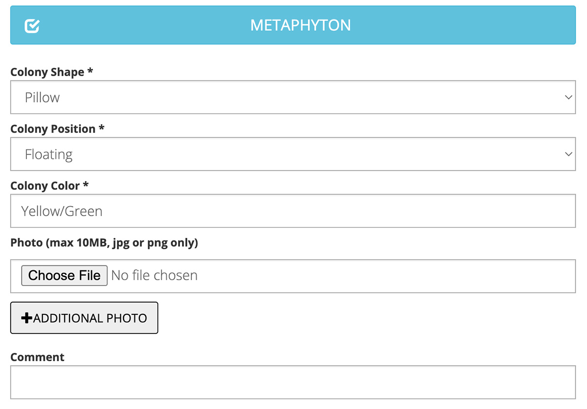 Click the blue "Metaphyton" button to expand the section. If you are submitting data as part of a project, minimum requested fields may be highlighted in blue.