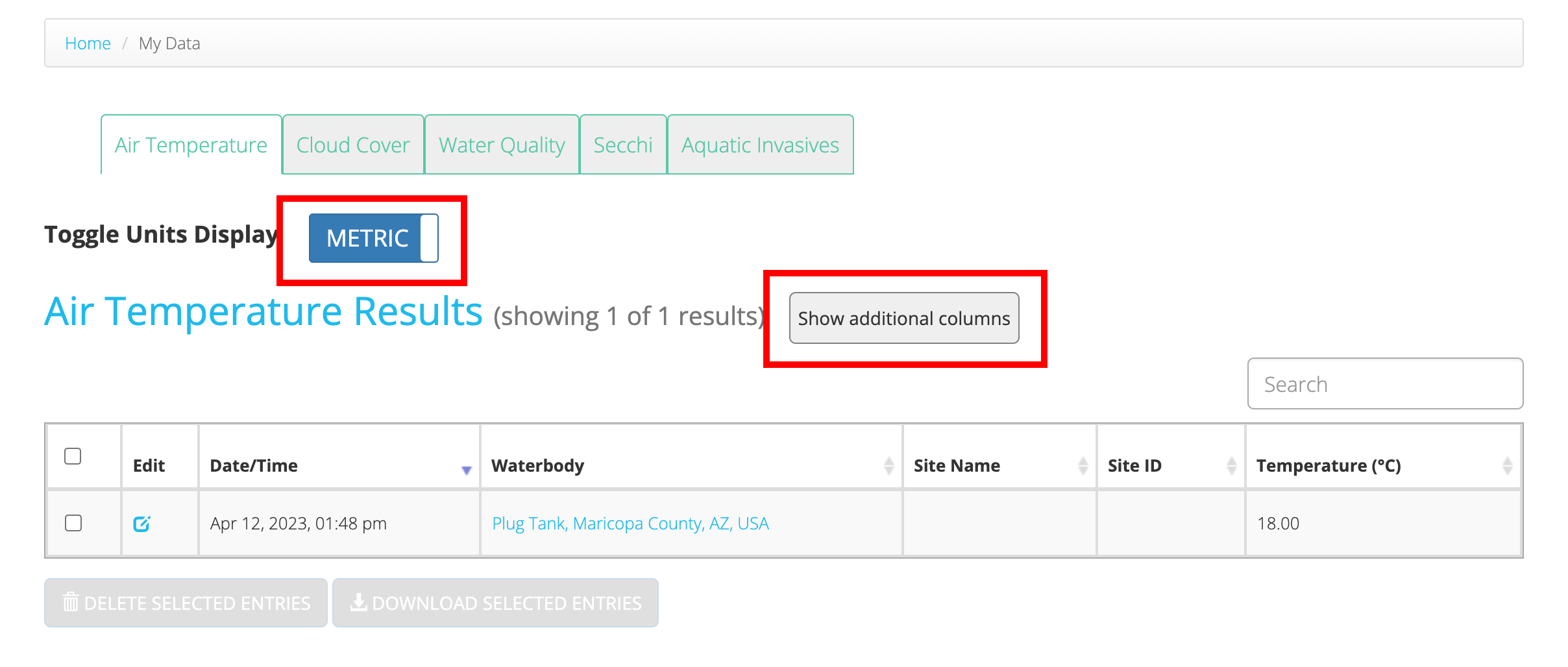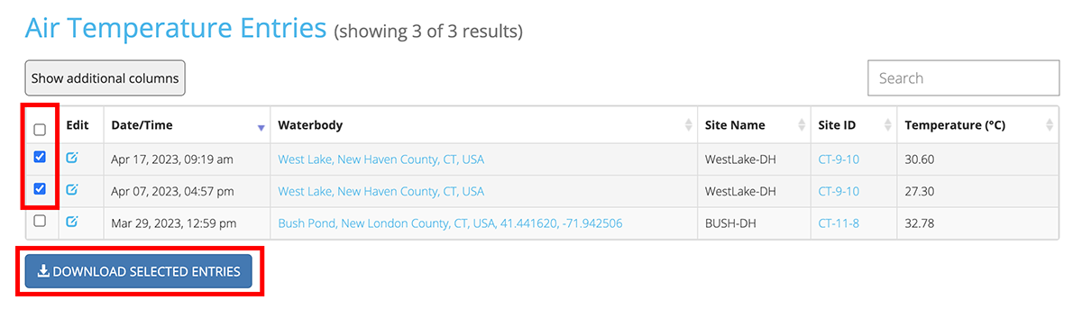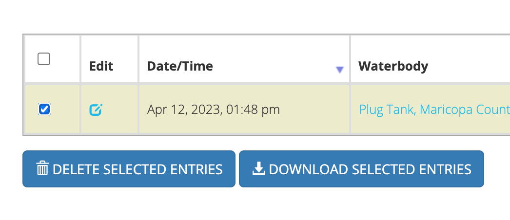 To download or delete data entries, you will need to select those entries. You can select entries by clicking the checkbox in the leftmost table column. You can also double click a table row to select it. Once you have selected your entries, they can be downloaded or deleted by clicking the corresponding button at the bottom of the table.