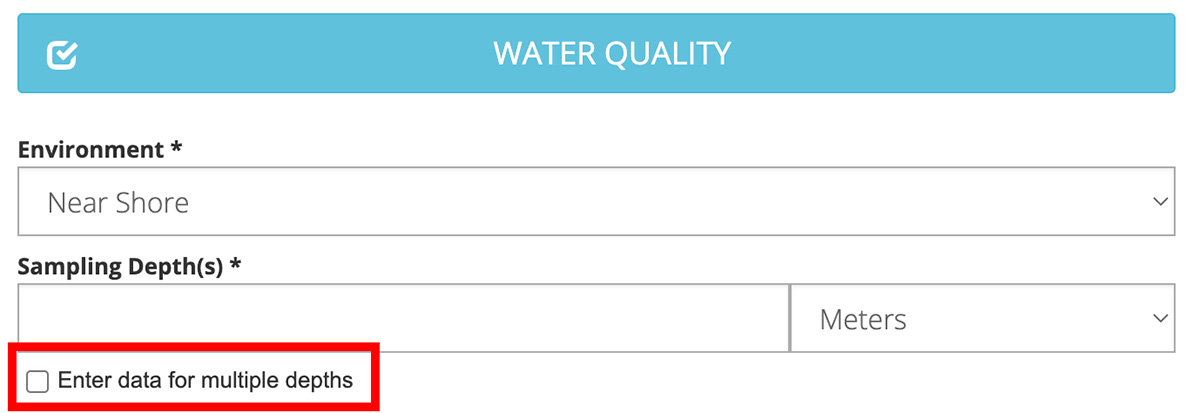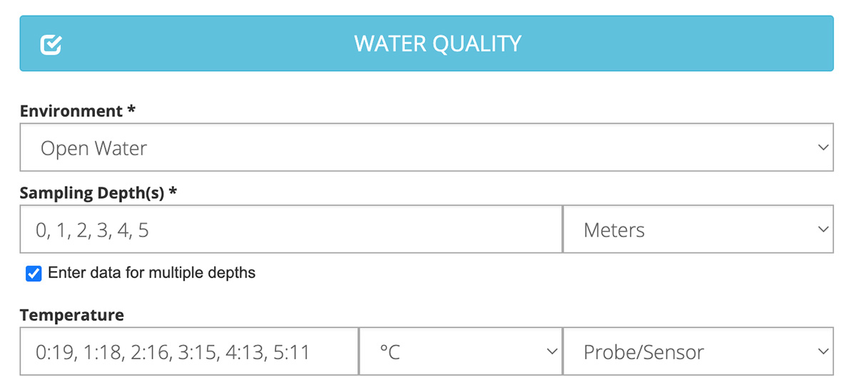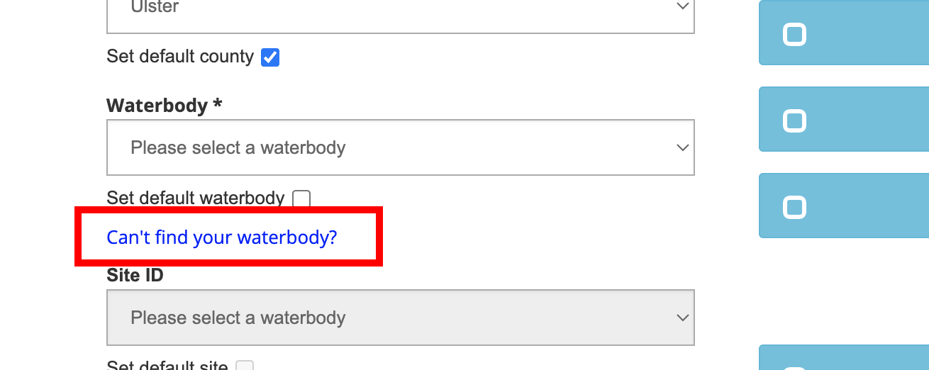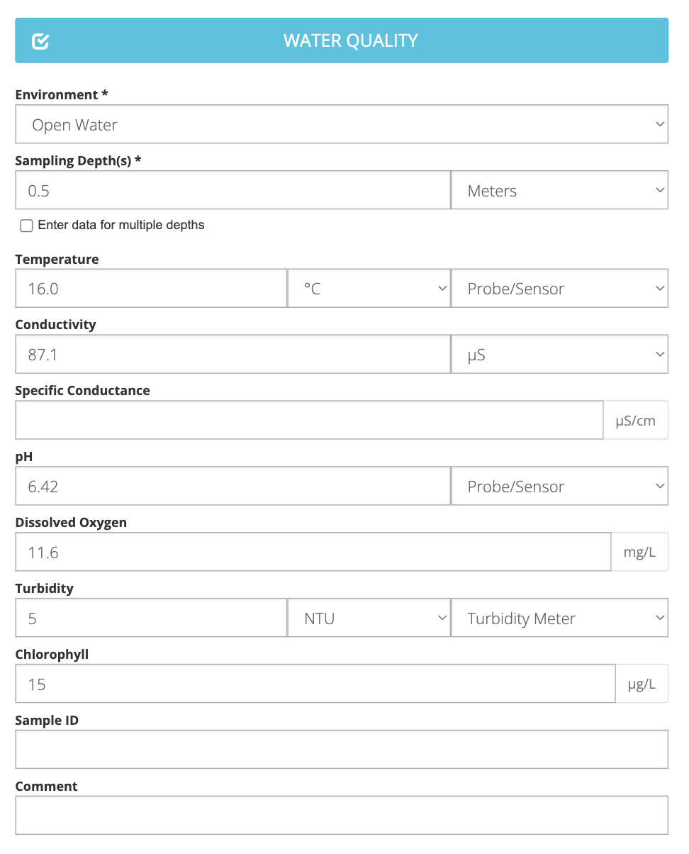 Note: If you are submitting data as part of a Project, your selection of Waterbodies may also be limited by that particular Project. In this case, you may not see all of your preferred Waterbodies. If you would like to have additional Waterbodies included in a Project, you will need to reach out to the Project Administrator.