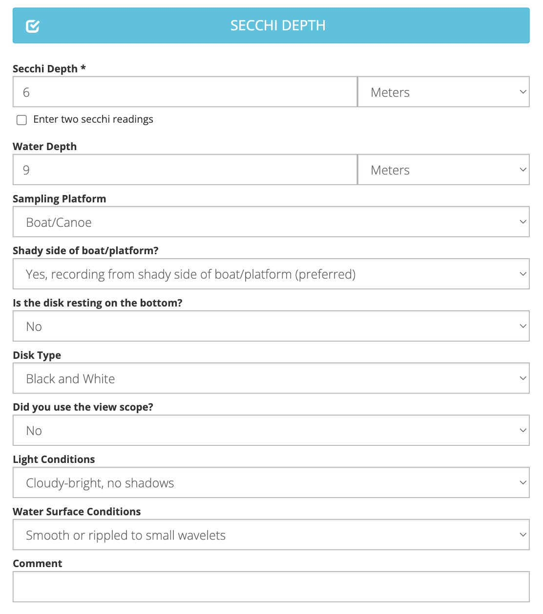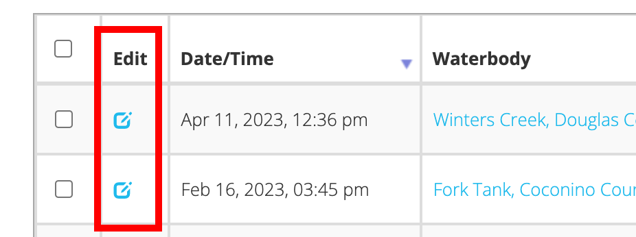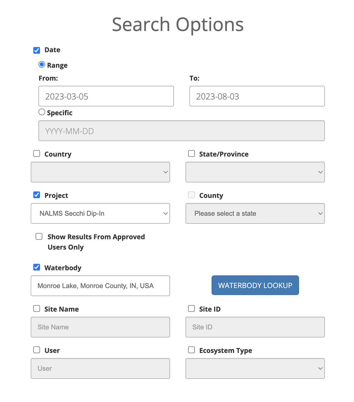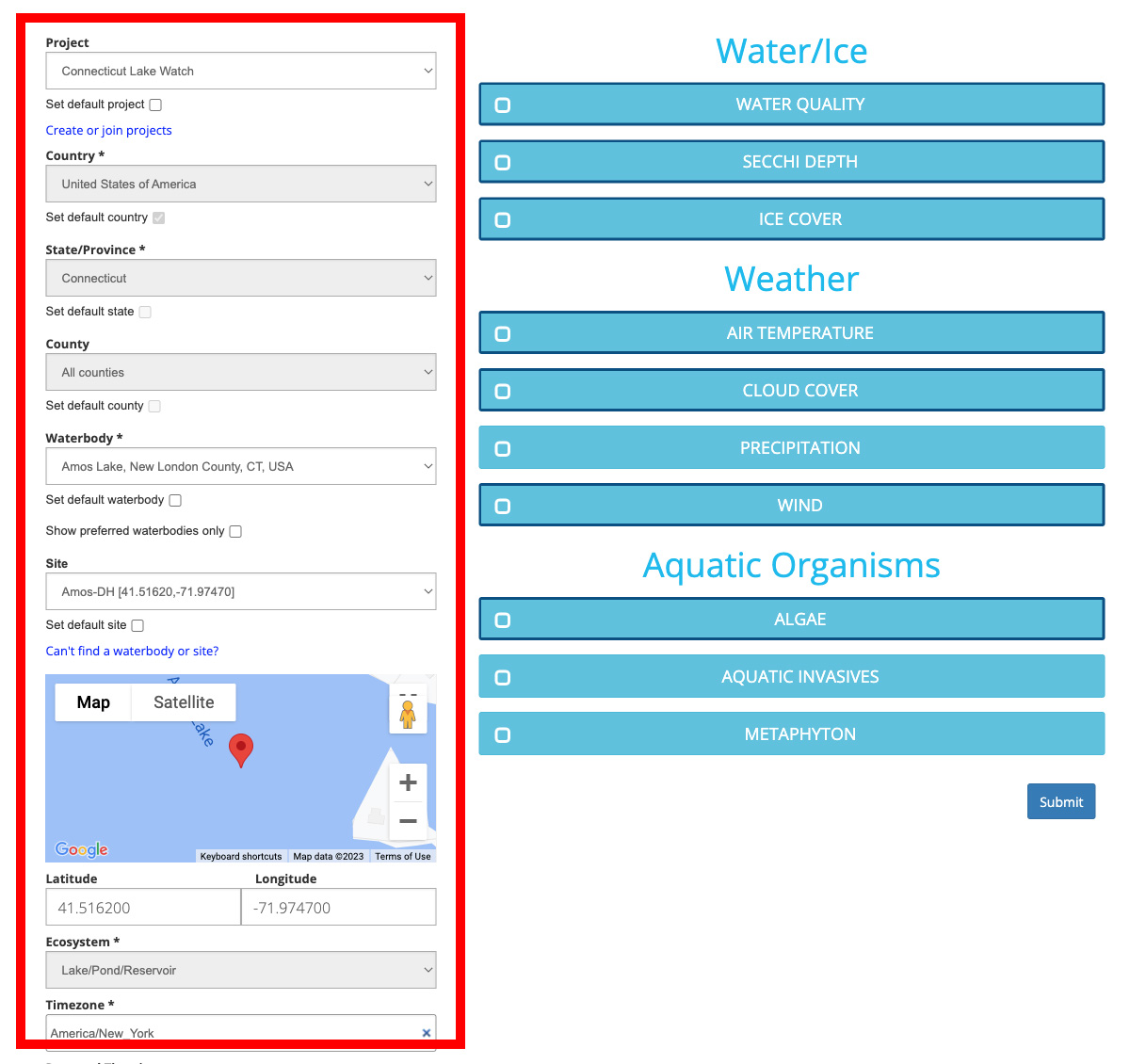 Note: If you are submitting data as part of a Project, your selection of Waterbodies may also be limited by that particular Project. In this case, you may not see all of your preferred Waterbodies. If you would like to have additional Waterbodies included in a Project, you will need to reach out to the Project Administrator.