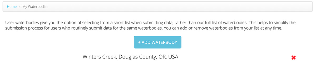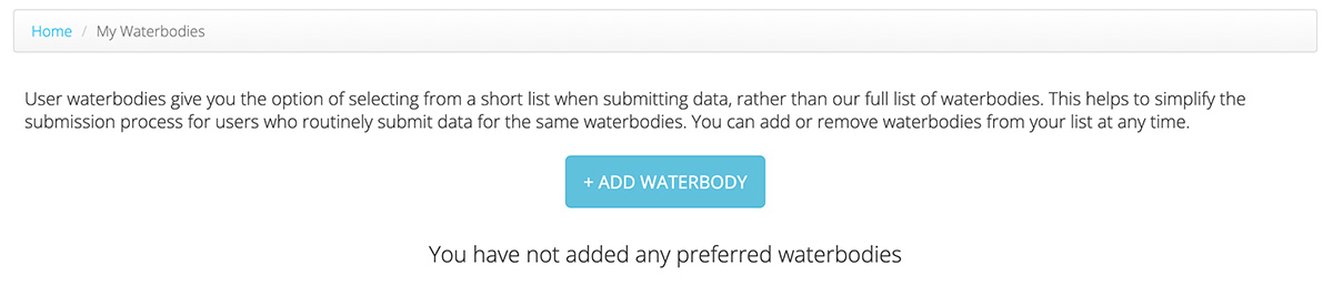 You can add Waterbodies to the “My Waterbodies” list associated with your profile to give you the option of selecting from a short list when submitting data, rather than our full list of Waterbodies. This helps to simplify the submission process for users who routinely submit data for the same Waterbodies. You can add or remove Waterbodies from your list at any time.