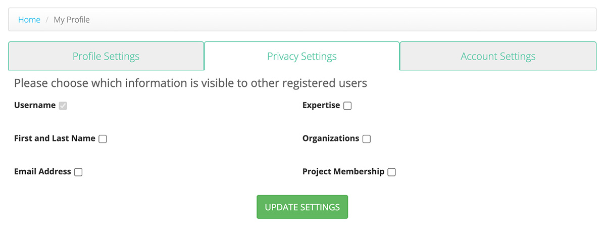 Note: If you make a request to become an approved user for a Project, all of your profile information will be made available to the Project Administrator, regardless of your privacy settings.