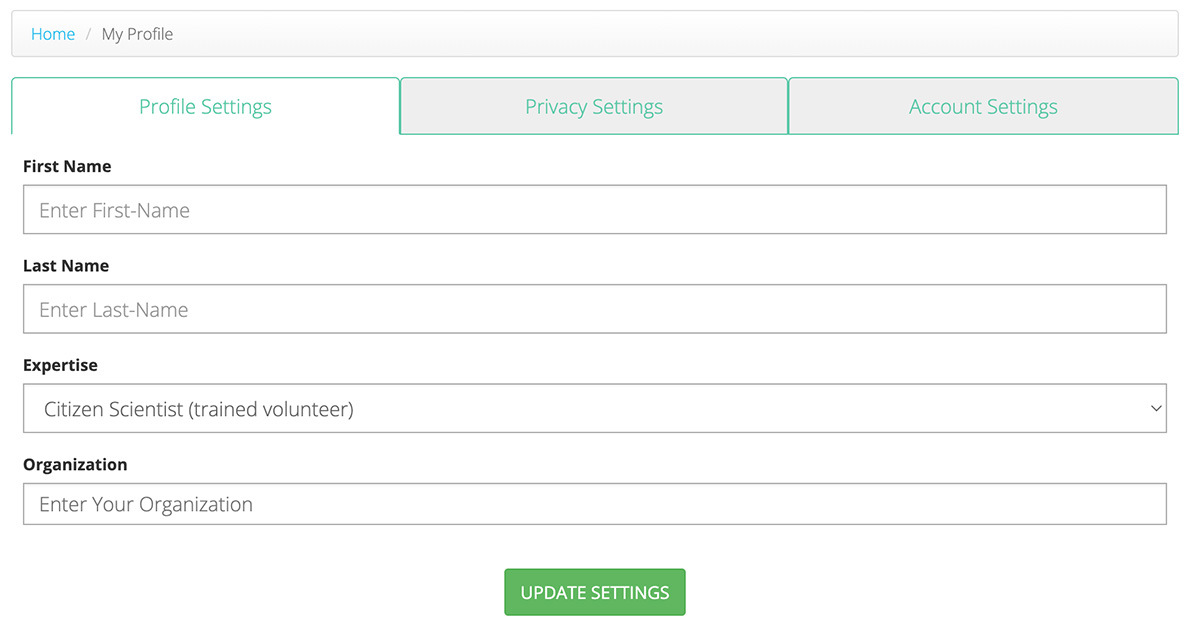Important: It is essential that you update your profile before submitting data to our system, particularly if you plan on submitting data as part of a Project.