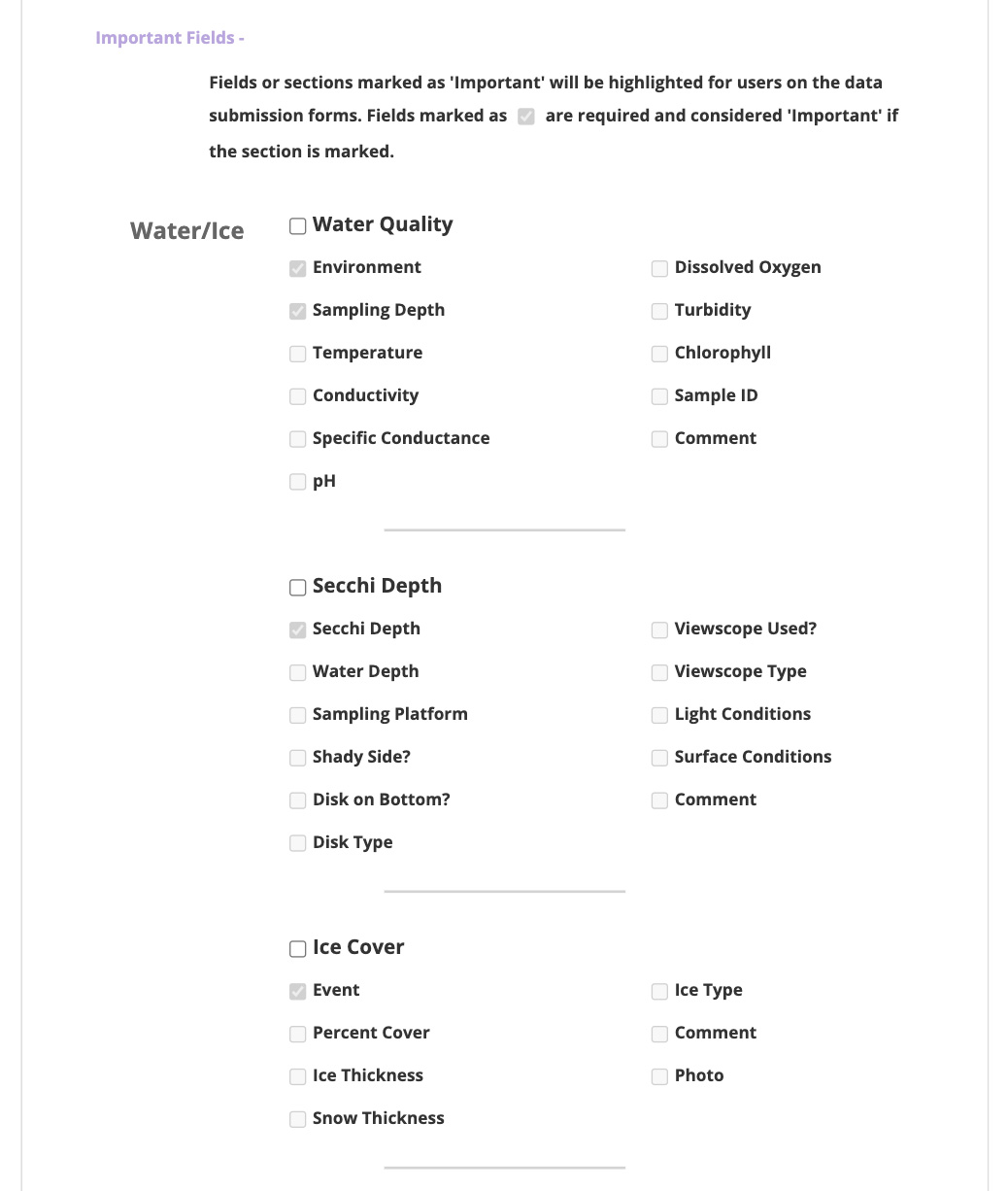 To select your Project's important fields, click the blue 'Important Fields +' text area to expand the section. You will see ten different data types (Water Quality, Secchi Depth, Ice Cover, etc) split into three different categories (Water/Ice, Weather, and Aquatic Organisms).