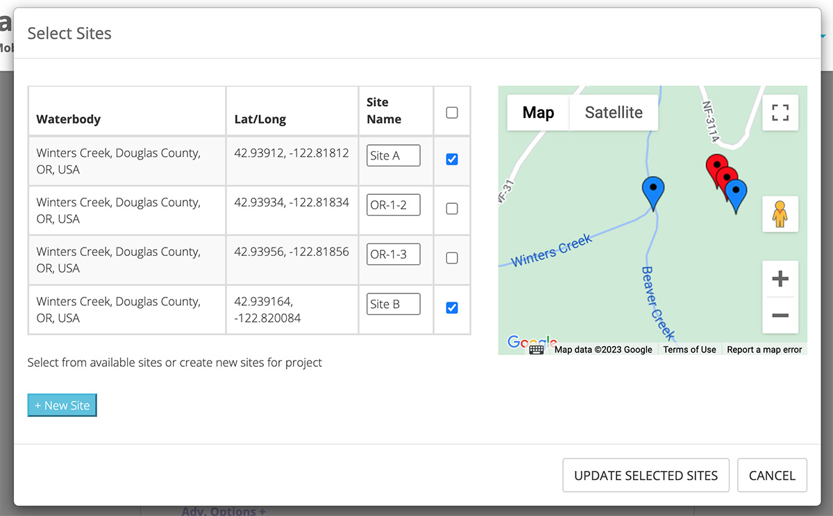Note: If you are submitting data as part of a Project, your selection of Sites may also be limited by that particular Project. In this case, you may not see all available Sites. If you would like to have additional Sites included in a Project, you will need to reach out to the Project Administrator.