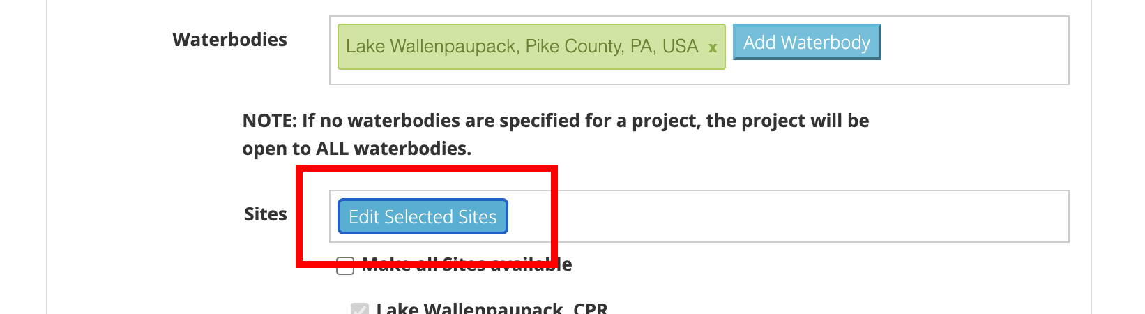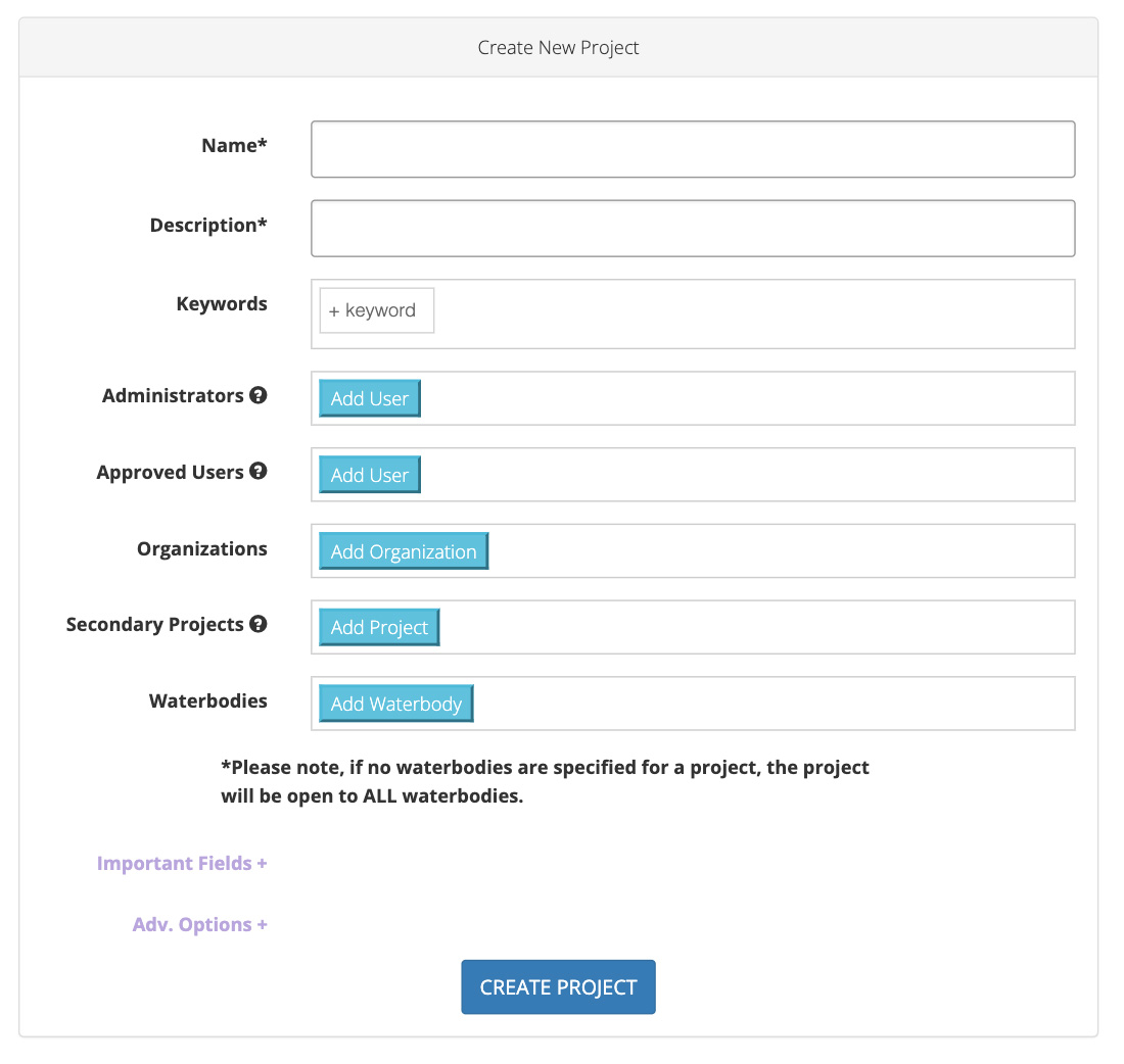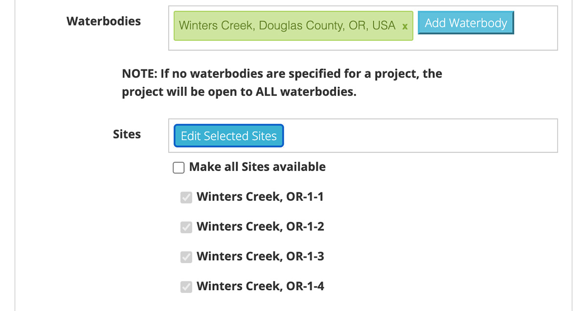 Waterbodies. If your Project is limited to collecting data for only a specific set of Waterbodies, it is recommended that you add those Waterbodies to your Project. This will simplify the data submission process for Users by only presenting them a short list of Waterbodies to choose from. If you choose not to add any Waterbodies to a Project, then that Project will be open to data submissions from ALL Waterbodies.