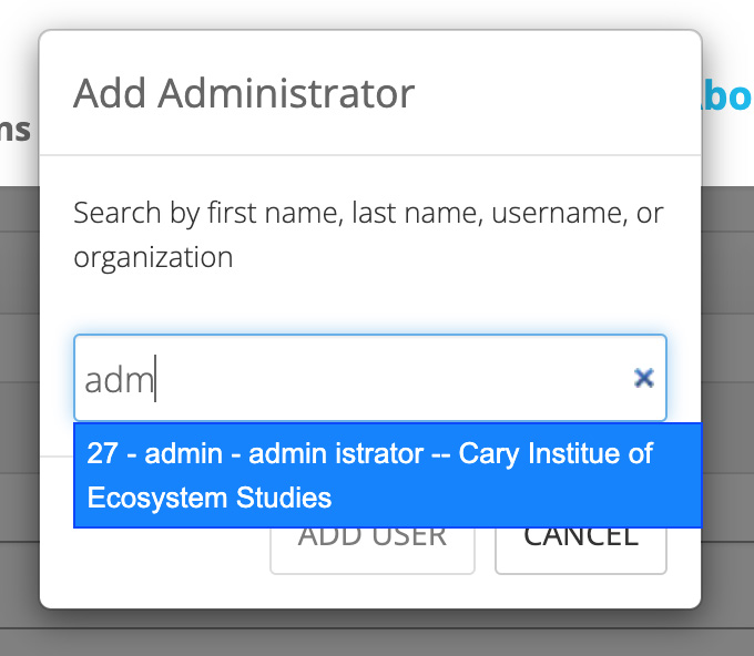 To add a new Administrator or Approved User, simply click the blue 'Add User' button next to the appropriate section. You can search for a user by their Lake Observer username (if you know it), by their first and last name, or by their organization (if they have designated this in their User Profile). Begin typing your search term until you see the name of the User appear. Select the User from the list and click the 'ADD USER' button to finalize your selection. If you need to remove a User after you have added them, click the 'x' next to their name. If you add a User as an Administrator, their is no need to add them as an Approved User.