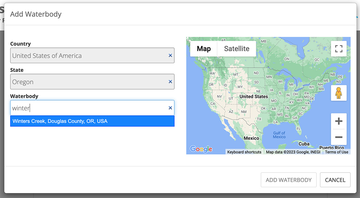 The ‘Add Waterbody’ pop-up window will appear. Enter your country, followed by your state or province.
