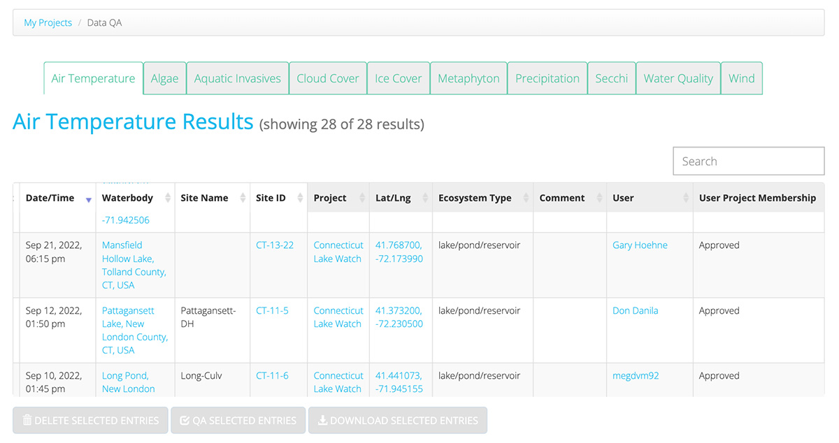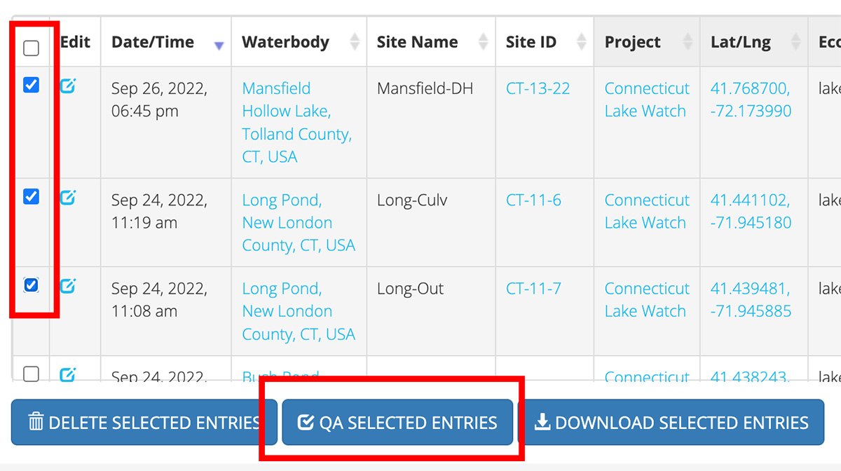 Once you have reviewed a submission and determined it to be good quality data, you can then select that data by ticking the checkbox on the left side of the data display table. Select all data that you wish to approve and then click the blue 'QA Selected Entries' button at the bottom of the table.