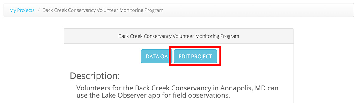 Enter a name for your Project. The Project Name can be anything but should be short, simple, and indicate to someone what the Project is related to. Some examples include, 'Connecticut Lake Watch', 'PLEON: Wallenpaupack Citizen Science Program', or 'Shelburne Pond Monitoring.' The Project Description should explain the purpose of the Project in more detail.