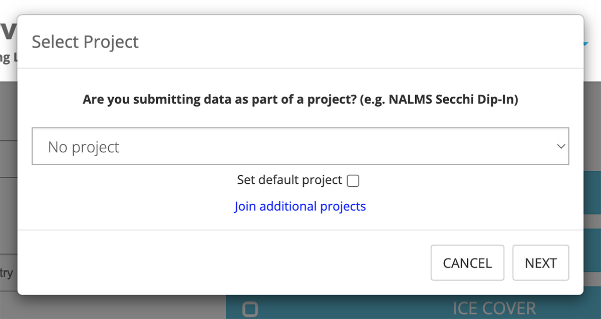A ‘Select Project' pop-up will appear. If you have joined any Projects they will appear in the dropdown menu. You can also choose to submit data without a Project. After making your selection, if desired you can check the ‘Set default project' option. This will allow you to skip this process the next time you submit data. Click "Next."
