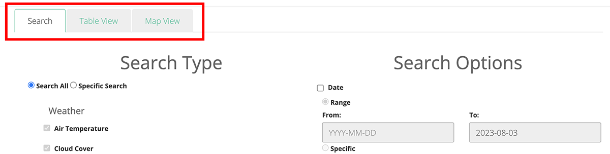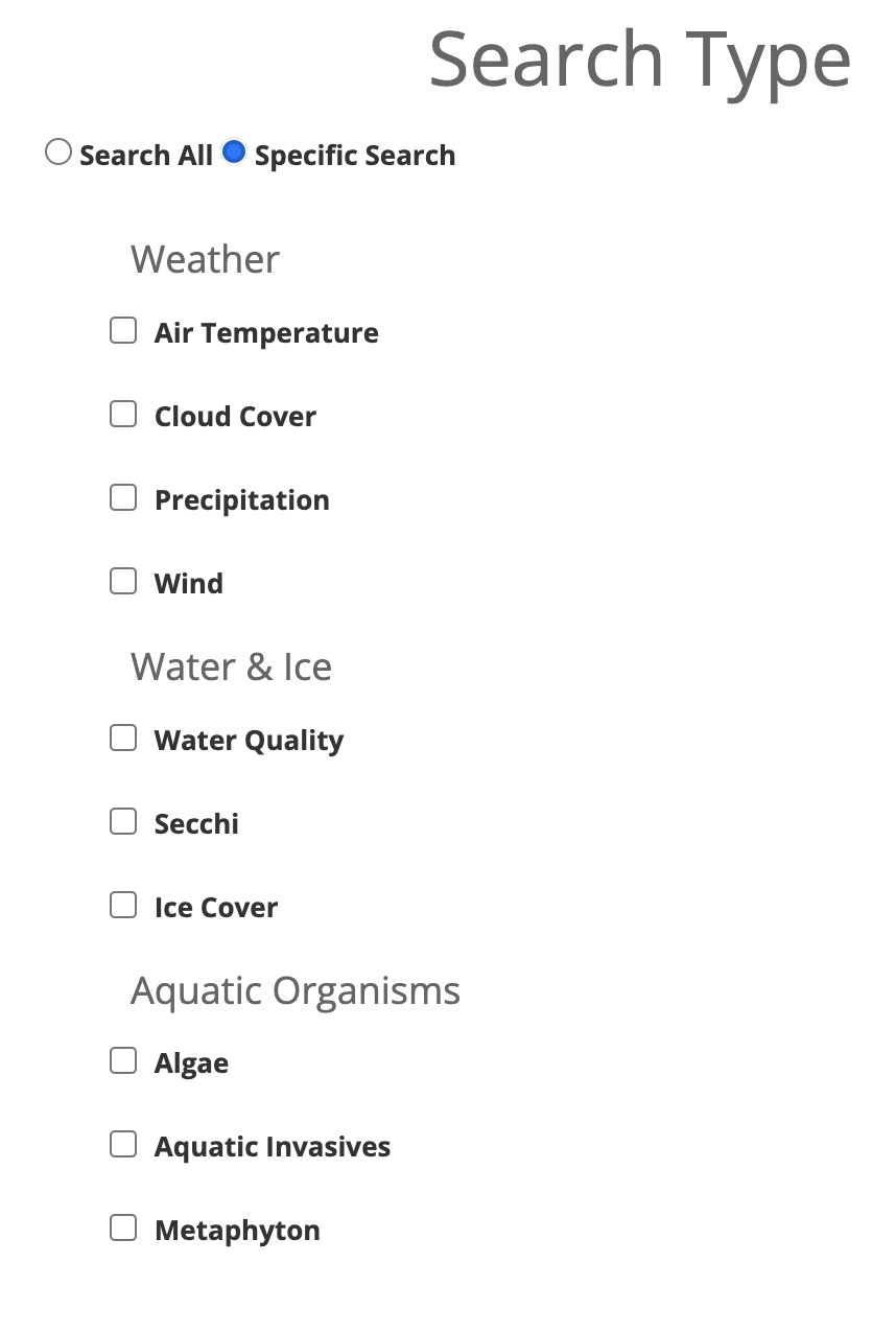 All data submitted to Lake Observer is available publicly to search and download. To search through our data, click the Search Data link under Data section in the navigation menu, or visit lakeobserver.org/search. On the search page, you will see that there are three different tabs available at the top of the page: Search, Table View, and Map View. The Search tab is where you can specify the parameters of your search, such as data type, date range, waterbody, site, etc. The Table and Map view tabs offer two different ways to view the returned data.