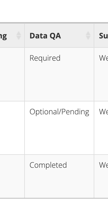 From your Data QA page, you will see all data listed for all Projects that require Data QA for which you are an administrator. You can click through the various data type tabs to view the data submissions.