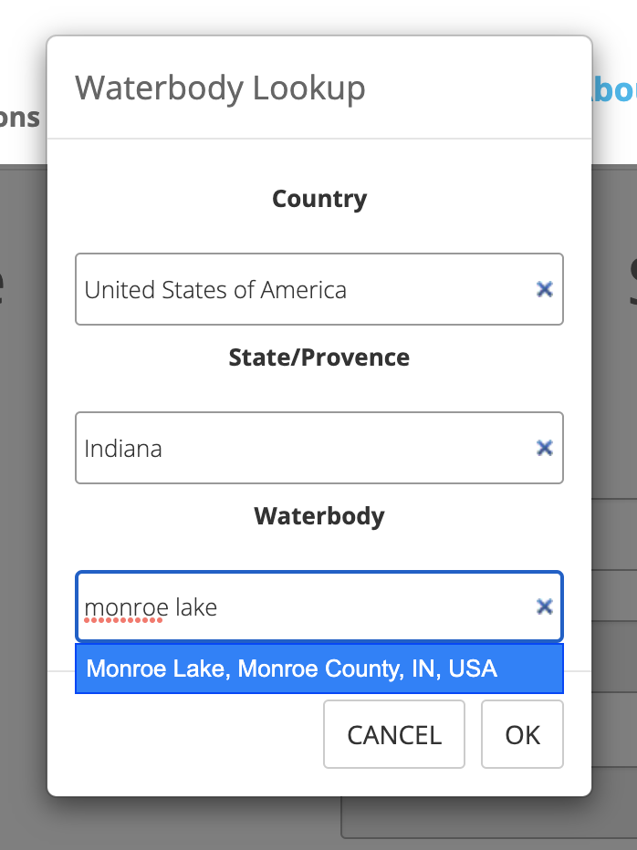 You will first need to enter the name of the waterbody. You will then enter the country or countries in which the waterbody lies. If entering a waterbody for the US or Canada you will also need to enter the state/province or states/provinces in which the waterbody lies. If entering a waterbody for the US you will also need to enter the county in which the waterbody lies. If the waterbody lies within multiple counties, select the county in which the majority of the waterbody lies, or the county in which the majority of the sampling might take place.