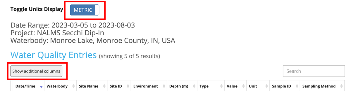 After you have clicked the 'Search' button you will be redirected to the search results in the table view. You will see your search filters listed at the top of the tables. Each data type will be listed in its own table. There is also a units toggle button at the top of the page that allows you to switch between imperial and metric units display. Some table columns such as Project name, and lat/lng are hidden by default. These additional columns can be shown or hidden by toggling the 'Show/Hide additional columns' button.