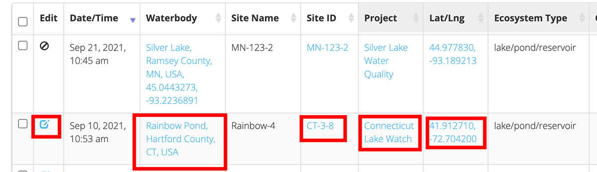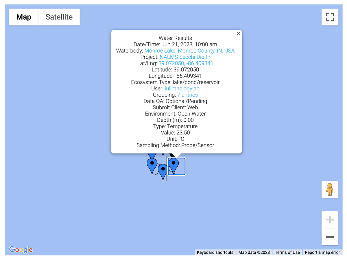 A grouping represents a set of data that were submitted at a single location around the same time. Groupings are automatically created when submitting data. For example, if you submit data via one of our mobile apps, and if you were to include air temperature data, cloud cover data, and secchi data, all of those submissions would become part of a single grouping. If submitting water quality data, each measurement type entered will create a separate entry, but all of those entries will be grouped together. Likewise, if you submit water quality data at various depths, all of the depth readings will be part of the same grouping. See our section on Viewing Data for more information on how to view data groupings.