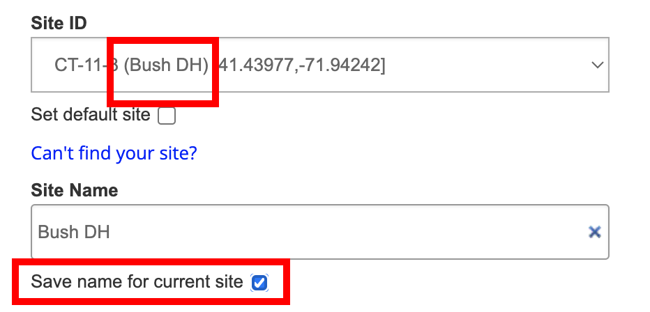 If you are submitting data outside of a Project and wish to assign a name to a Site, you can do so from the data submission page. When submitting data, after you have selected your Waterbody and Site, you can enter the desired name in the Site Name text field. If you wish to save this Site Name for future use simply check the box below the text field. During future submissions, when selecting your Site from the dropdown menu, your custom name will appear alongside the auto-generated site identifier.
