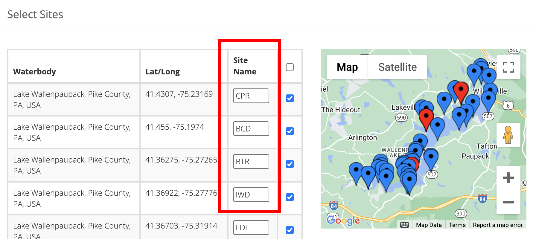 You will notice that every Site is given a Site Name. The Site Names are assigned automatically based on the State and County data of the Waterbody. You can assign a custom name to a Site by editing the text box that corresponds to that Site.