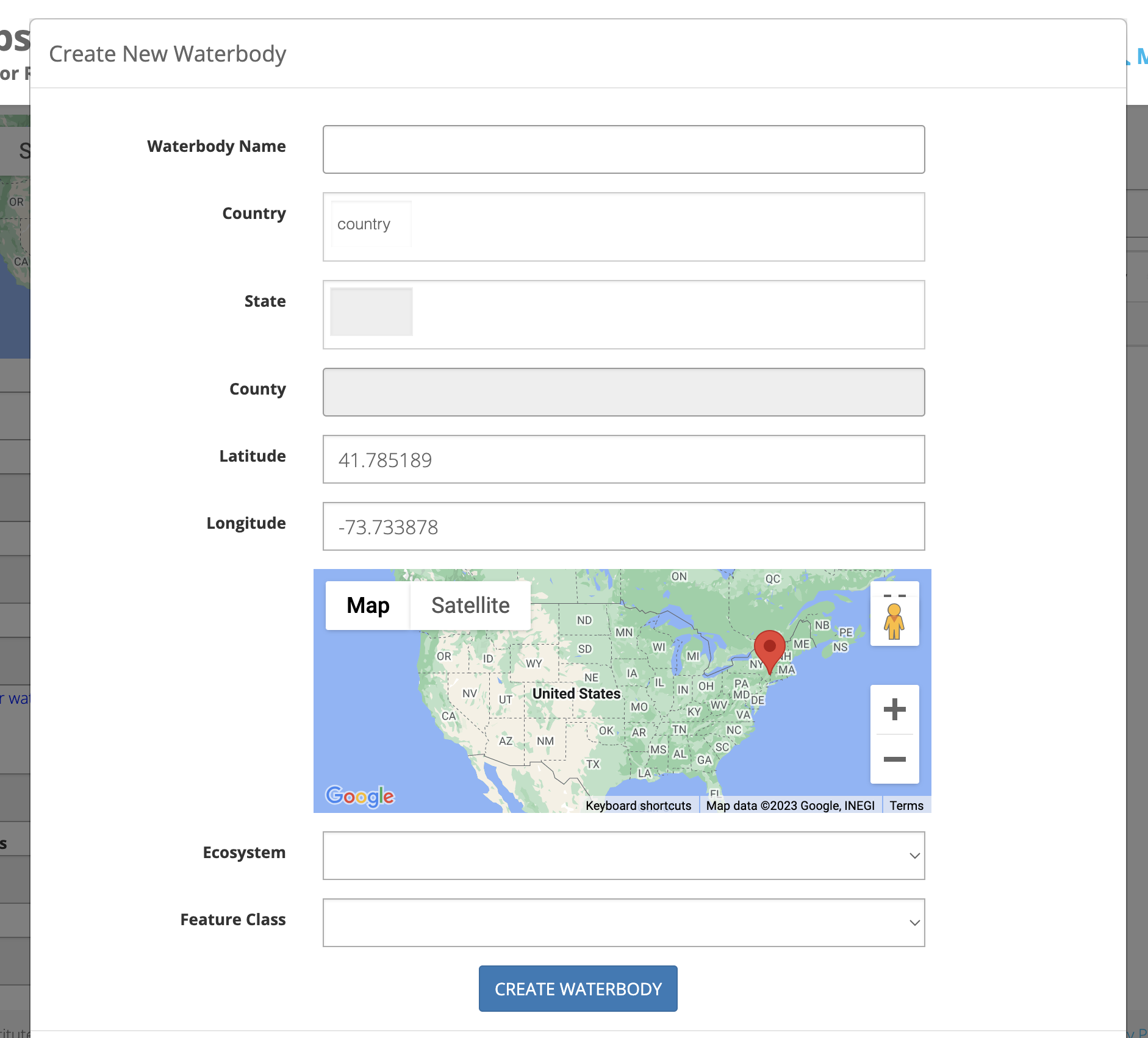 Note: Please be sure not to create a duplicate entry for a waterbody that is already in our system. You can search for all waterbodies that are currently in our system from the waterbodies page. If you've created a waterbody by mistake and need to update or delete the waterbody that you've created, please contact our support team for assistance.