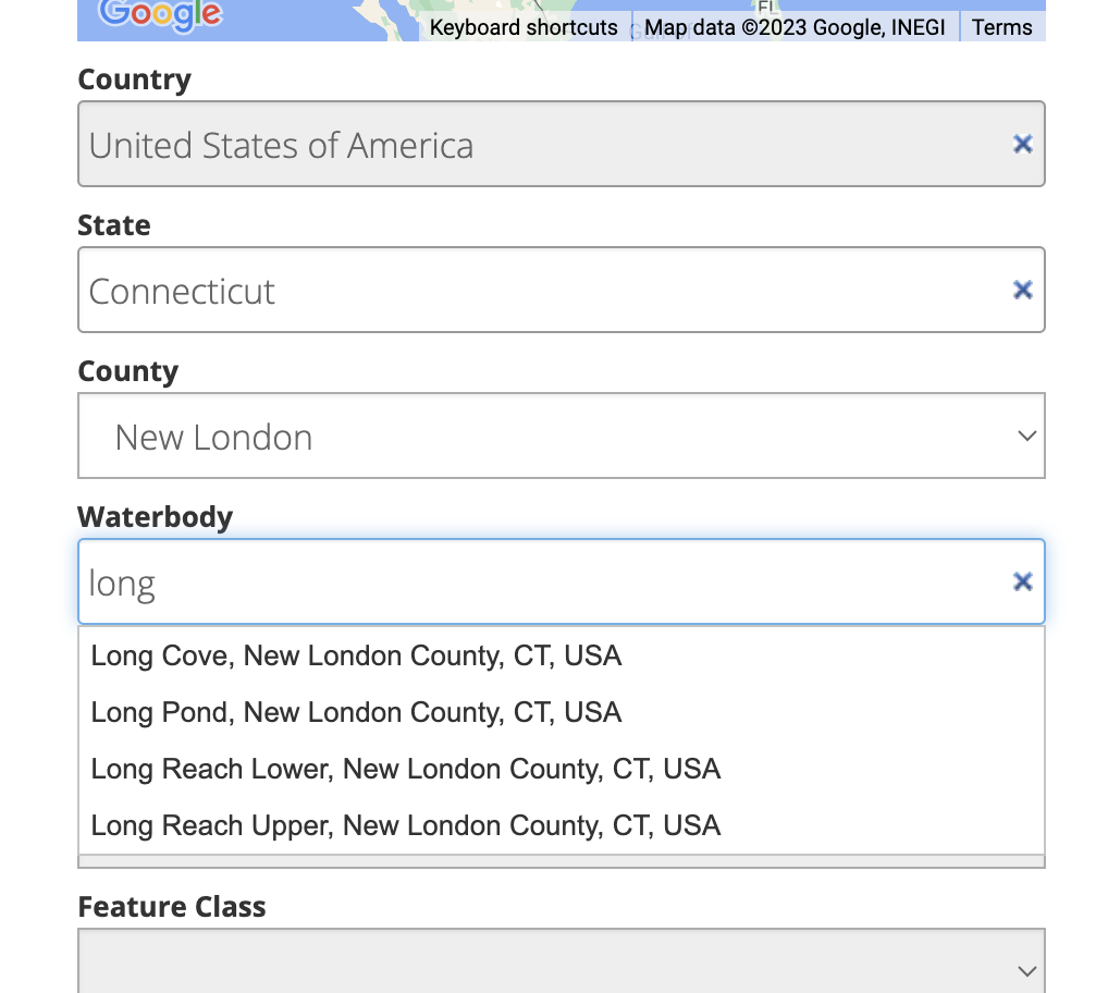 To create a new Site for a waterbody, start by visiting the waterbodies page. Enter the country, state, and county data for the waterbody. Type the waterbody name into the waterbody text field and select the waterbody from the autocomplete list that is generated.