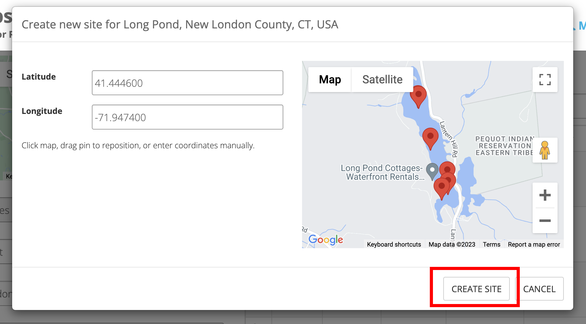 In the form that appears, you will only need to enter the latitude and longitude values for your Site. You can set the latitude and longitude values by clicking on the map. You can also click and drag the map pin to reposition it. Or you can enter the coordinates manually in the text fields. Click the 'Create Site' button when you are done.