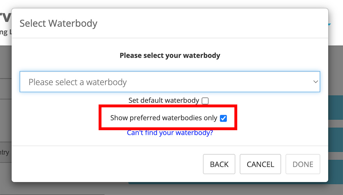 A ‘Select Waterbody' pop-up will appear. Select your Waterbody from the list of available Waterbodies. If you have set any Preferred Waterbodies, you can check the 'Show preferred Waterbodies only' checkbox. This will limit your Waterbody options to only your preferred Waterbodies.